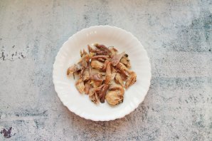 Дастаньце з супу курыцу, лук і бульбу. Цыбулю выкіньце, яна нам больш не спатрэбіцца, а бульбу размясіце вілкай.