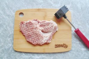 Мясо вымыйце і прамокніце папяровым рухалям. Выкладзіце на раздзяляльную дошку і добра аббейце з абодвух бакоў.