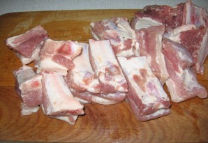 Разразаем рабры на невялікія кавалачкі. Калі вам трапіліся вельмі тлушчныя рабры, рэкамендую зняць частку тлушчу.