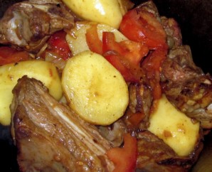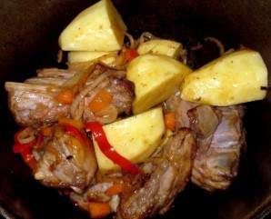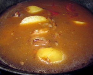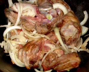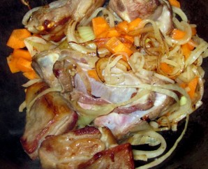 Шорпу лепей гатаваць у казане. Разаграваем у ім раслінную алей і паджарваем рабрынкі да залатыстай карочкі. Потым дадаем да мяса ачышчаны і нарэзаны цыбулю. Перамешваем і паджарваем 3-4 хвіліны.