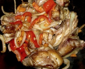 Через 2-3 хвіліны туды ж пасылаем ачышчаны і нарэзаны балгарскі перац. Смажым на моцным агні, таму не забываем мешаць.
