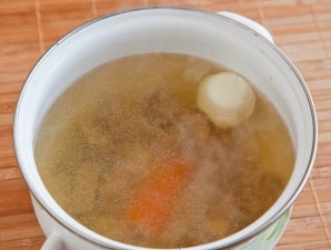 Прыгатаваную бараніну зварыце ў двух літрах вады. Зняце пёнку з кіпячонага бульёну і дадайце нарэзаную крупна моркву і цэлы лук. Варыце 40 хвілін.