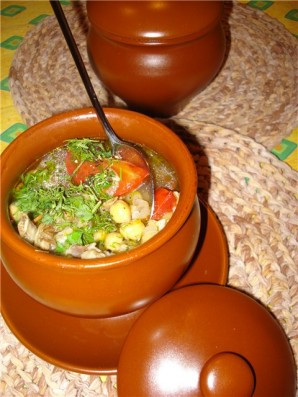З гатовага бульёну дастаём мяса і нарэзаць яго кавалачкамі. Кладзем яго ў гаршочкі, сюды ж — нарэзаныя і ачышчаныя агародніны, зверху заливаецца бульёнам. Далей дадаецца лавровы ліст, соль, перац і сметанковае масла. Ставім гаршочкі на 30 хвілін у разагрэтую духоўку.