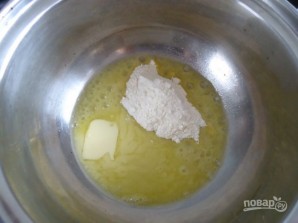 1. Смажнік ставлю на агонь, кладу ў яго сметанковае масла, растапляю яго, дасыпаю пшанічную мукі і змяшаю вянчыкам да аднастайнасці.