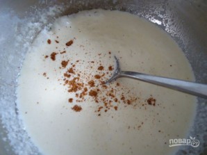 2. Тонкай цячэнні ўліваю ў сотэйнік вершкі, пастаянна разбіваючы венчыкам, каб не было згусткаў. Пасмаку дадаю прыправы (мускатны арэх і кары), салю і даганяю соус да кіпення, бязперапынна разбіваючы венчыкам.