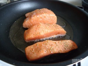 3. Рыбу памываю і нарэзаю кавалачкамі, натыраю сумесшчу праванскіх трав і падсмажваю на раскіпячэлай скавародцы з даданнем падсонечнага алею па 1-2 хвіліны з кожнага боку.