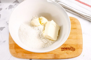 Выложите в глубокую емкость сливочное масло комнатной температуры, всыпьте пшеничную муку, половину сахарного песка и соль. Тщательно разотрите.