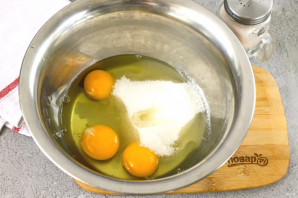 В глубокую емкость вбейте куриные яйца, всыпьте оставшийся сахарный песок, выложите сметану и все тщательно взбейте.