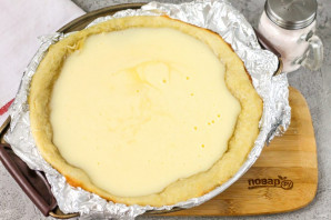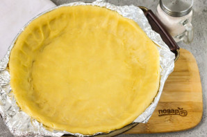 Разогрейте духовку до 180 градусов и выложите в форму для запекания песочное тесто, распределите его руками, заходя на бортики. Поместите форму в духовку и запеките тесто 15 минут.