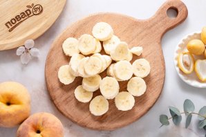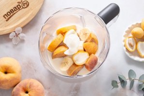 Пакладзіце персік, фінікі і банан у чашу блендара, налійце малако миндаля. Здробіце да аднастайнасці.