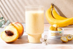 Гатовы смузі пералейце ў шклянку. Смузі з персікам і бананам гатовы!