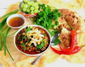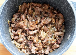 Разаграйце масла ў казане або цяжкадоннай каструлі. Запячыце цяліну бараніны, нарэзаную брусочкамі, да румяной карочкі. Дадайце цыбулю, нарэзаную кубікамі, і запячыце да залатога колеру. Калі мяса жорсткае, дадайце шклянку вады і тушуйце да мяккасці. Калі ж бараніна маладая, пераходзіце да наступнага этапу прыгатавання.