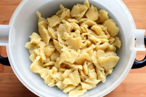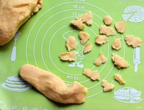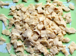 Падзяліце на некалькі частак і скочце ў колбаскі. Заплюшчце колбаскі і адрыўвайце ад іх невялікія тонкія кавалачкі цеста – манпар.