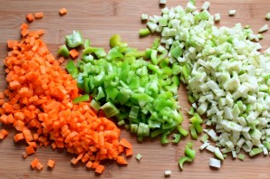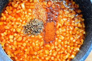 Дадайце ў ваджу прыправы: папрыку і молоты чырвоны востры перац. Сумесь гародзяў і насенне карыяндра дробна памеліце і дадайце ў каструлю.