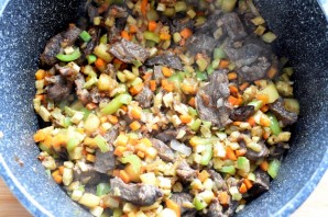 Дадайце да мяса бульбу і моркву, пасмажце, перамешваючы, 3-4 хвіліны. Потым дадайце рэдзьку і слодкі перац. Смажце яшчэ 3-4 хвіліны.