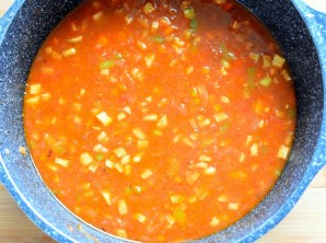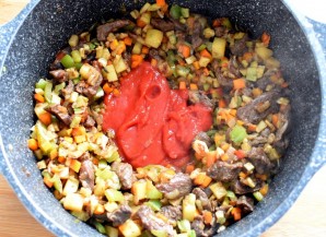 Дадайце пратэртыя памідоры і давядзіце да кіпення. Паменьшыце агонь і тушице без пакрыўкі прыкладна 15 хвілін. Потым улійце столькі кіпятку, каб змесціва кастрылі было пакрыта на 2-3 пальцы. Манпар павінен быць густым. Тушыце яшчэ 10-15 хвілін.