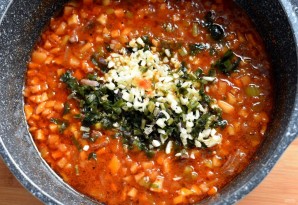 Дайце закіпяціць і дадайце джусай або лук-парэй і цёплы часнок, а таксама нарэзаны часнок. Перамяшайце, накрыйце крышкай і дайце пастаяцца прыкладна 10 хвілін.