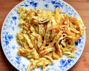 Пакуль мясо настаецца, пажарце тонкія яечныя блінчыкі, змяшаўшы яйкі з сольлю і вадой і добра ўзбіўшы вілкай. Немага астыўце блінчыкі і нарэжце іх вялікай саломкай.