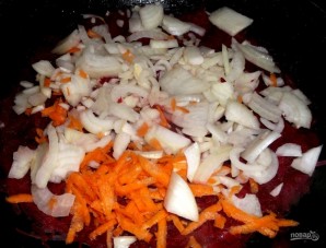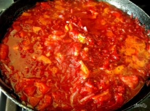 1. Спачатку ставім бульён і варым мяса да гатоўнасці. Такі булачнік гарачы класічны вельмі добры, калі яго гатаваць на ялавіне, але вы можаце выкарыстоўваць любое мяса паводле вашага смаку. Потым пасмажваем лук і моркву на раслінным алеі. Дадаем памідор, смажым на слабым агні.