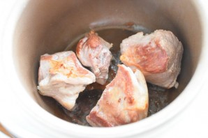 Мясо бярыце з тлушчом і скурай, якую трэба добра выскабіць. Накрошчвайце мяса на вялікія кавалкі, калі ў вас мяса з косткамі. У мяне гэты раз задняя рулька без косткі. Абсмажце мяса з усіх бакоў, пачынаючы з мясной стараны, да добрай ружовай карочкі. Пад канец абсмажвання дадайце адну парэзаную цыбуліну і абсмажце яе разам з мясам. Потым залейце мяса кіпятком па ўзровень з мясам, пасаліце і папярчыце па смаку, і пераключыце мультыварку на рэжым «Тушэння» на 4 гадзіны. Калі ёсць рэжым «Мультыварэння», усталявайце тэмпературу 90 градусаў і час 2 гадзіны.