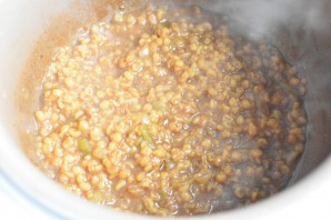Мясо выйміце з мультываркі. Пакладзіце ў астатні бульён дробна пакроены лук і паўгатовую перлавую крупу. Пастаўце тушыцца ў рэжыме «Тушэнне».