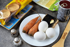 Подготовьте необходимые ингредиенты. Яйца и морковь предварительно отварите. Морковь обычно готова через 15-17 минут, а яйцам нужно не больше 10.