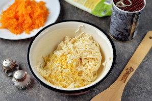 Натрите очищенную морковь на мелкой терке, отложите ее в пока в сторону. В глубокую миску натрите плавленый сырок и яйца.