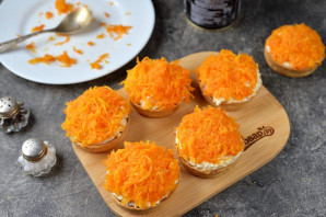 Сверху выложите вареную морковь, разровняйте ее по всей поверхности закуски.