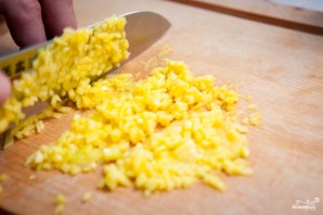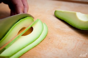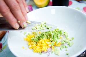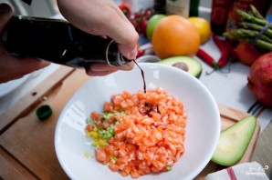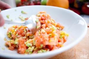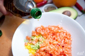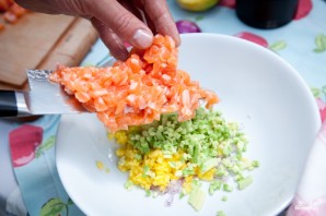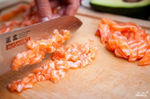 Лосось постарайтесь порезать такими же кубиками, как и манго с авокадо. Но не стоит превращать рыбу в кашицу, форма кубиков должна держаться.