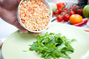 Сверху выложите тартар, утрамбуйте его слегка, чтобы он не распался и форма держалась.