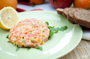 Готовый тартар из лосося и авокадо подавайте с лимоном и гренками.