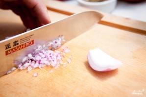 Лук порежьте мелкими кубиками. Главная задача в приготовлении тартара - нарезать все продукты одинаковыми кусочками.