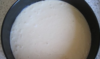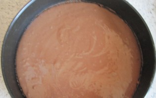 Приготовим тесто для светлого коржа. Смешиваем: стакан сметаны, 0,5 стакана сахара, 0,5 ч.л. соды, 2 яйца и 2 стакана муки. Переливаем тесто в форму, выпекаем корж в духовке 15 минут, температура 180 градусов.