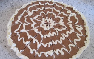 Формируем тортик. Смазываем светлый корж темным кремом, затем выкладываем темный корж. Смазываем его светлым кремом и т.д. Собираем торт, чередуя коржи и крем. Верхушку торта оформляем в виде паутинки.