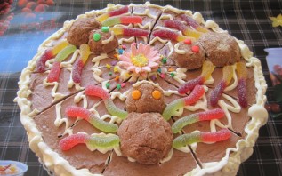 Выкладываем паучков на верхушку торта. Из желатинок выкладываем лапки. Перед подачей на стол ставим торт в холодильник на 1-2 часа.