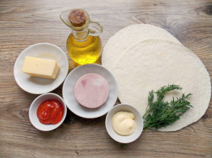 Подготовьте все необходимые ингредиенты для приготовления тортильи с ветчиной.