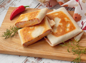 Подойдёт и к празднику, и на каждый день. Закуску из тортилий можно сделать очень просто с такой пикантной начинкой. Ветчину можно заменить на любую колбасу, сыр и зелень взять на свой вкус. Поджарить ее можно и на сковороде-гриль, тогда на их поверхности получатся красивые полоски Подавайте закуску к столу.