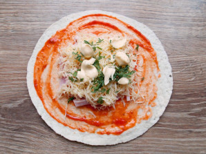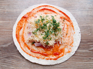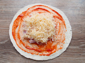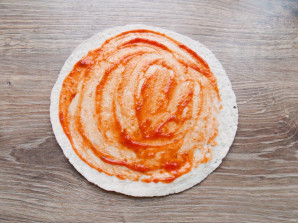 Каждую тортилью смажьте томатным соусом, не доходя до края 2 сантиметра.