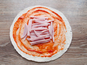 Ветчину порежьте соломкой и выложите на середину тортильи.
