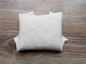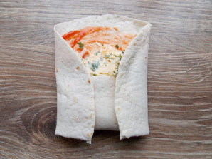 Сложите тортилью конвертиком. Для этого подогните один край, затем два боковых.