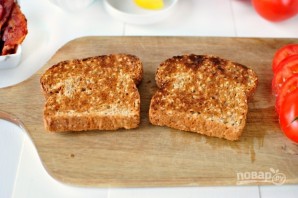 3. Хлеб запекайте в тостере. В это же время обжарьте бекон с обеих сторон до хрустящей корочки.