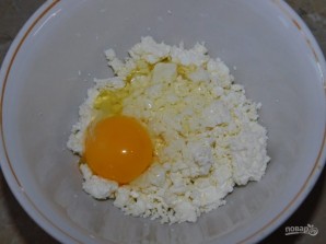 В творог добавьте яйцо сахар и ванилин.
