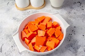 Тыкву очистите от кожуры и семян, нарежьте мякоть на небольшие кусочки. Форму для выпечки смажьте маслом, выложите подготовленную тыкву.