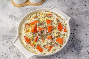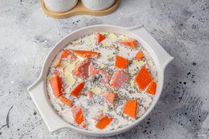 Подготовленным сливочным соусом залейте тыкву. Поставьте запекаться в заранее разогретую духовку и запекайте 10-15 минут. Время запекания зависит от сорта тыквы.