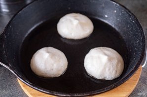 Сковороду разогрейте на умеренном огне и смажьте тонким слоем растительного масла с помощью силиконовой кисти. Ложкой выкладывайте небольшие порции теста, формируя небольшие панкейки. Температуру нагрева установите минимальную. При выпекании панкейков сковороду прикройте крышкой и дайте примерно 5 минут на выпечку одной стороны. За это время панкейки заметно поднимутся. Если вам хочется прям очень высокие панкейки, то как только тесто схватится, поверх ложкой добавьте еще немного теста, тем самым увеличивая высоту оладий и вновь прикройте сковороду крышкой. Примерно через пять минут выпекания на минимальном огне лопаткой переверните пышные блинчики на другую сторону и продолжайте выпекать еще 3-4 минуты.