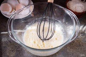 В отдельную сухую и чистую миску залейте белки и добавьте щепотку соли. Взбивайте белки до появления пены и в этот момент начинайте по чуть-чуть подсыпать 30 грамм сахара, при этом не прекращайте взбивать миксером. В итоге должна получиться воздушная пена, которая при переворачивании миски вверх дном остается неподвижной.