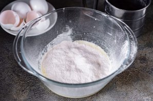 В отдельной миске перемешайте муку с разрыхлителем и просейте эту смесь в миску к желтковой смеси.