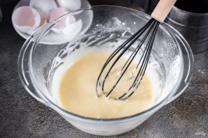 Венчиком вешайте муку до полного исчезновения комочков. Тесто на этом этапе получается очень красивое, текучее, по консистенции похоже на жирный майонез.