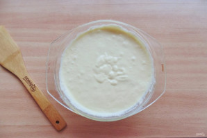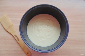 Чашу мультиварки смажьте маслом и выложите тесто. Установите режим "приготовление на пару" и готовьте ровно 10 минут. После пеките чизкейк 50 минут при режиме "подогрев". Затем снова 10 минут на пару и 50 минут на подогреве. Чизкейк печется в мультиварке ровно 2 часа. За это время её нельзя открывать.