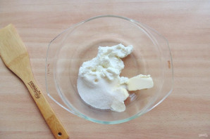 Выложите в миску творожный сыр, сливочное масло и половину нормы сахара.